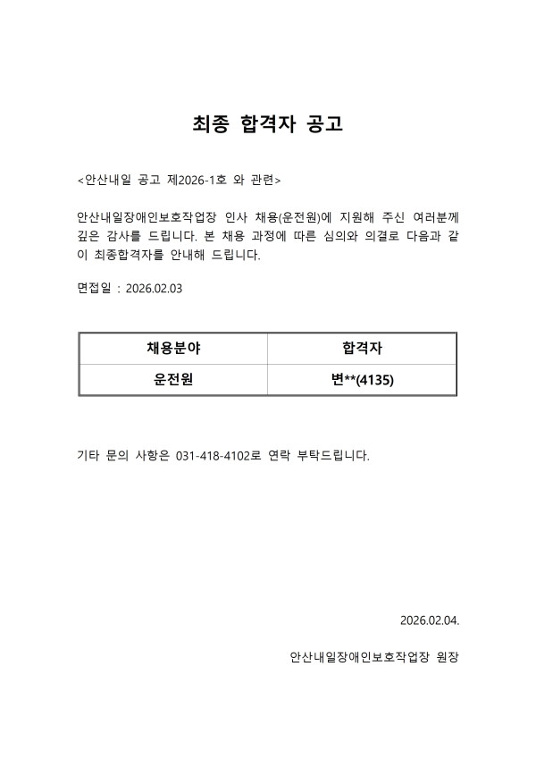 안산내일장애인보호작업장 운전원 채용결과 공시