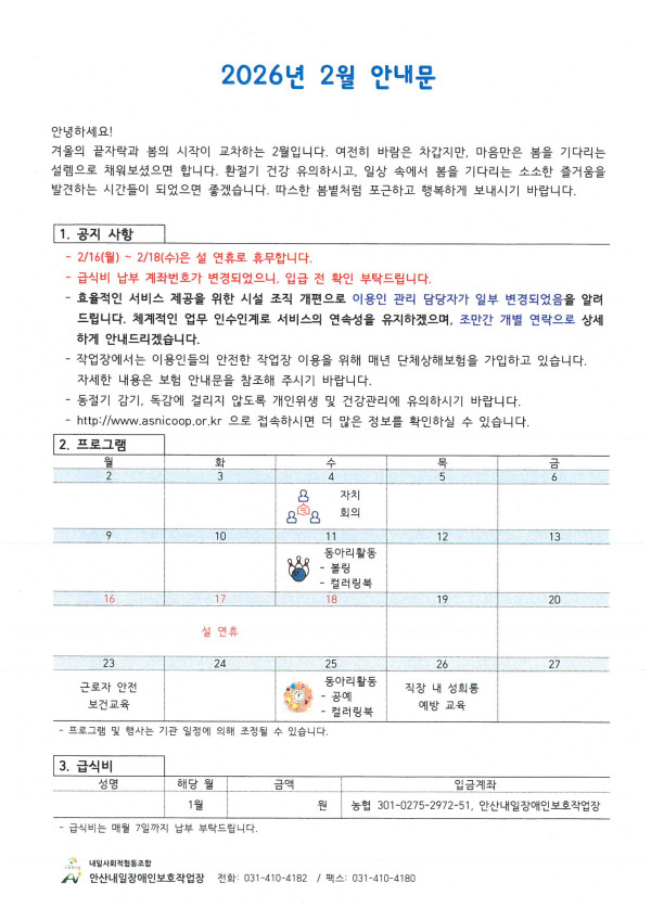 2026년 2월 가정안내문 및 식단표 페이지 정보 작성자 최고관리자 작성일26-02-02 14:37 조회44회 본문 2026년 2월 가정안내문 및 식단표 댓글목록 등록된 댓글이 없습니다. 다음글 목록
